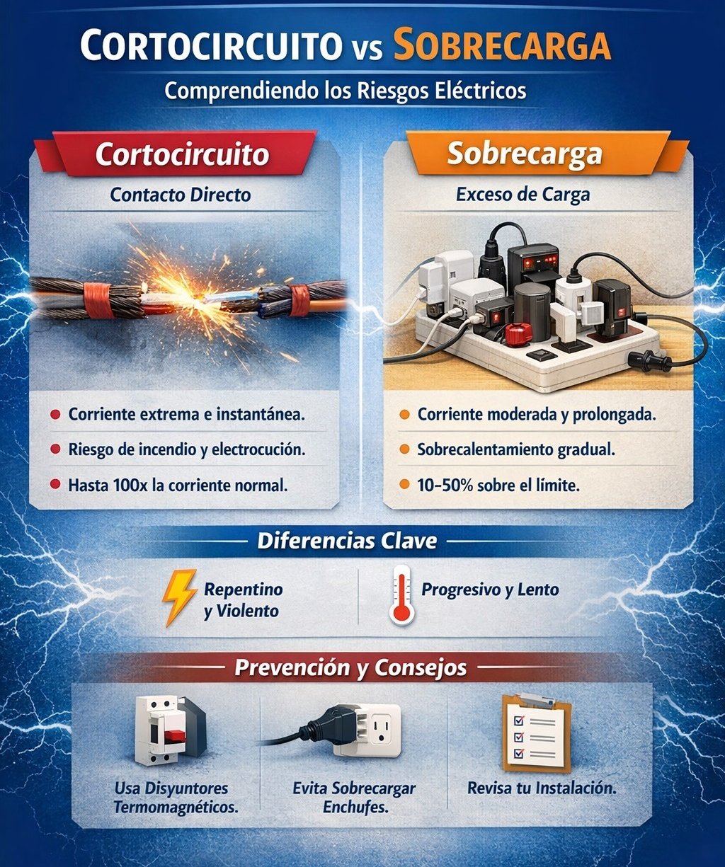 Diferencias principales: El cortocircuito es repentino y de alta intensidad (hasta 100 veces la corriente normal), mientras que la sobrecarga es progresiva y moderada (generalmente 10-50% por encima del límite). Ambos representan riesgos, pero el primero es más destructivo si no se protege adecuadamente.
