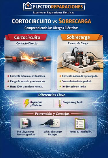 Descubre las diferencias clave entre cortocircuito y sobrecarga en instalaciones eléctricas. Aprende causas, efectos y prevención con Electroreparaciones para evitar riesgos como incendios en tu hogar o empresa.